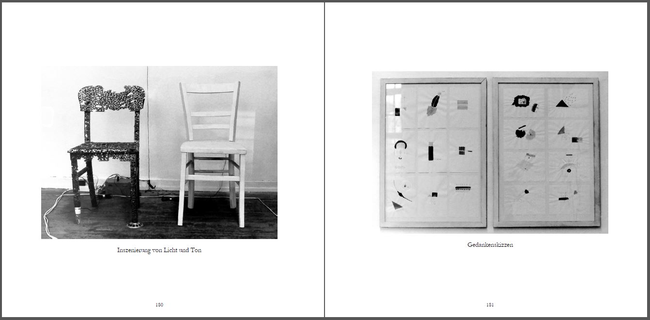 Beispiel: Ein gewöhnlicher Gegenstand (Stuhl), wird in den Gedankenprozess einbezogen. Licht (von der Glühbirne) und ein Summen (vom Lautsprecher) wechseln im gleichmäßigen Rhythmus. Licht und Ton vereinigt in einer etwas geisterhaften Inszenierung – für Gerd Jansen in dieser Zeit immer wieder typisch, die Kombination verschiedener Medien. - Nicht nur das Gesamtergebnis, sondern auch die vielen Bohrungen im Stuhl, weisen auf ein 5 Jahre später sehr wichtig werdendes Merkmal: die serielle Arbeitsweise.