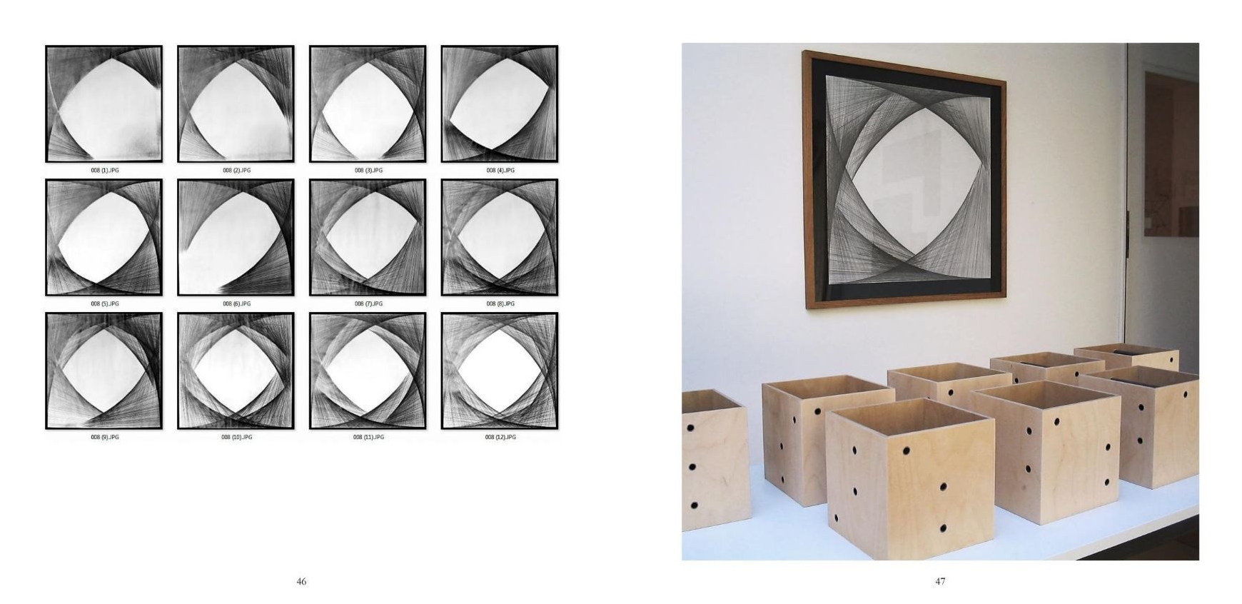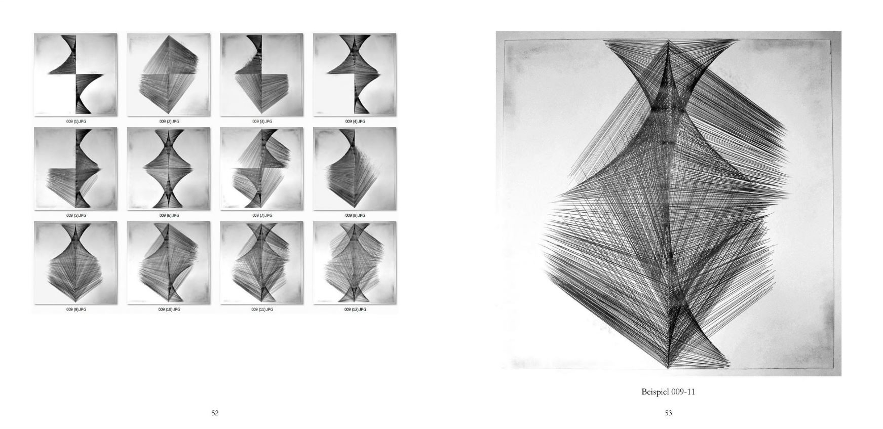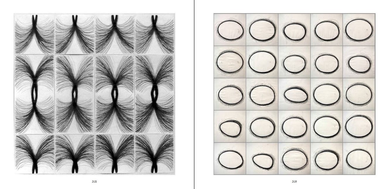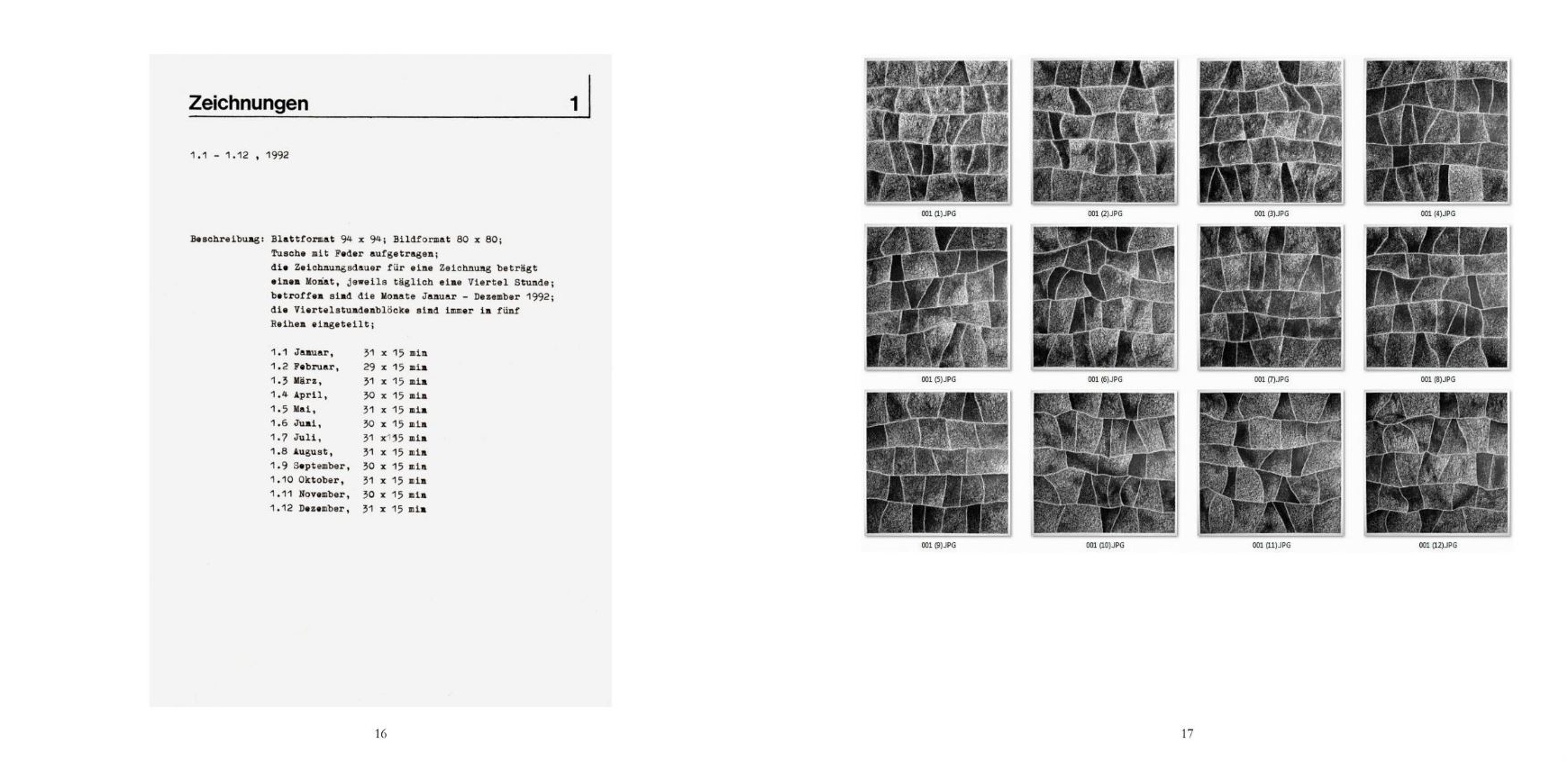 Die Wiederholung gleicher, sehr einfacher Zeichenabläufe erzeugte strukturelle Gebilde, deren Dichte auch Hinweise auf die Zeiträume des Entstehens gab. Grundform und Regelhaftigkeit bedurften nur noch der zeitlichen Streckung. Die serielle Vorgehensweise war die einfache Lösung Gestalten nach einem Prinzip zu entwickeln.